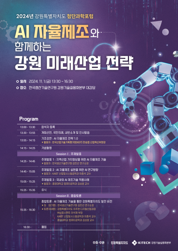 [충청뉴스큐] 강원특별자치도는 오는 11월 1일 한국생산기술연구원 강원기술실용화본부에서 ‘AI 자율제조와 함께하는 강원 미래산업 전략 포럼’을 개최한다.