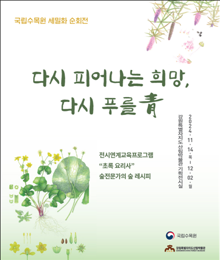 [충청뉴스큐] 강원특별자치도 산림과학연구원은 자생식물의 아름다움을 널리 알리기 위해 세밀화전 ‘다시 피어나는 희망, 다시 푸를 靑’을 11월 14일부터 12월 2일까지 강원특별자치도 산림박물관에서 개최한다.