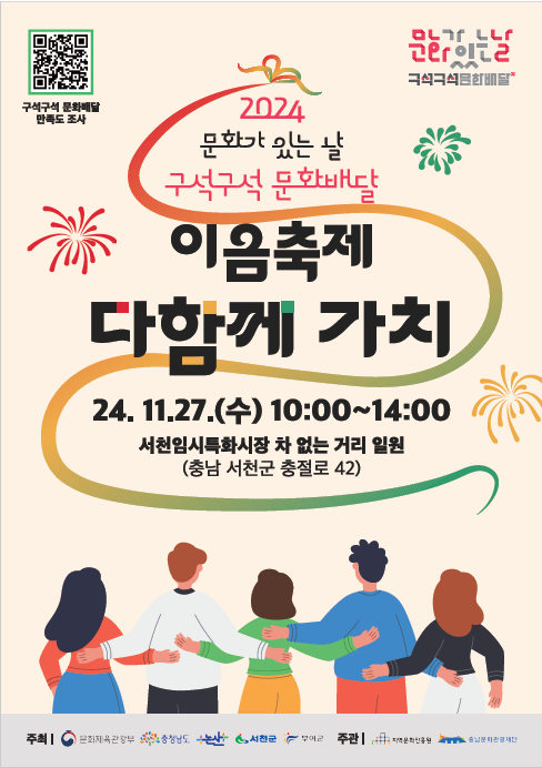 충남문화관광재단은 한 해 동안 성공적으로 진행한 2024 문화가 있는 날, 충청남도 ‘구석구석 문화배달’을 좀 더 많은 대중에게 알리고 지역 활력 및 문화향유 기회 확대를 위해 오는 11월 27일 서천특화시장에서 이음축제 “다함께 가치”를 추가로 진행할 예정이다.