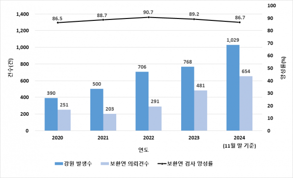 2020년부터 올해 11월까지 최근 5년간 지역 의료기관에서 의뢰된 CRE 검사와 양성 확인 건수가 △2020년 251건, 양성 217건 △2021년 203건, 양성 180건 △2022년 291건, 양성 264건 △2023년 481건, 양성 429건 △2024년 654건, 양성 567건으로 매년 증가추세다.