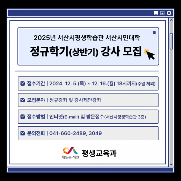 [충청뉴스큐] 충남 서산시는 평생학습관이 ‘2025년 서산시민대학 정규학기 상반기’ 강사를 공개모집하고 있다고 11일 밝혔다.