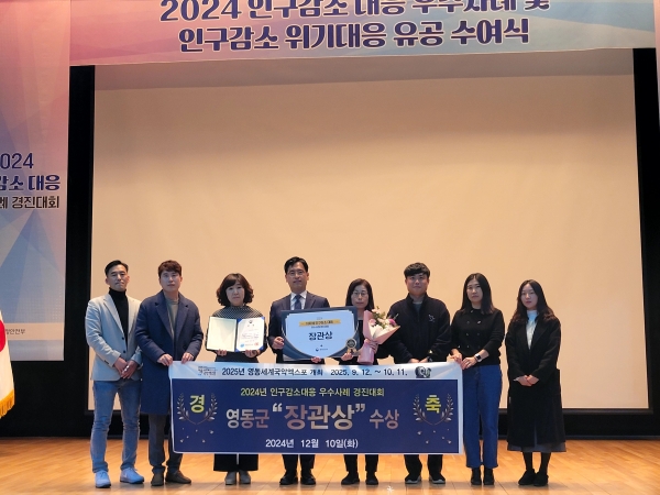 [충청뉴스큐] 충북 영동군이 지난 10일 정부세종청사에서 열린 ‘2024년 인구감소대응 우수사례 경진대회’에서 행정안전부 장관상을 수상하며 지역발전의 모범 사례로 주목받았다.