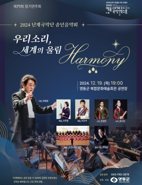 이 송년음악회는 영동군이 주최, 주관하며 난계 박연선생의 고장에서 우리 음악을 활성화함으로써 군민에게 국악을 통한 정서적 안정감을 제공하는 품격있고 수준 높은 국악 공연으로 잘 알려져 있다.