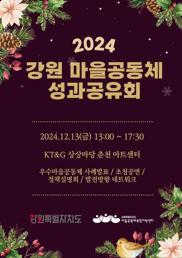 [충청뉴스큐] 강원특별자치도는 `24년 강원 마을공동체를 대상으로 12월 13일 오후 1시부터 KT&G 상상마당 춘천아트센터에서 “2024 강원 마을공동체 성과공유회”를 개최한다고 밝혔다.