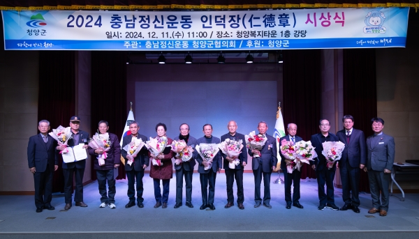 [충청뉴스큐] 충남정신운동 청양군협의회는 어진 마음으로 크게 덕을 베풀어 주위 사람들의 덕망이 되는 자를 표창하기 위해 지난 11일 청양군 복지타운 대강당에서 수상자와 충남정신운동 회원 등 총 50여명이 참석한 가운데 ‘2024 인덕장 시상식’을 개최했다.