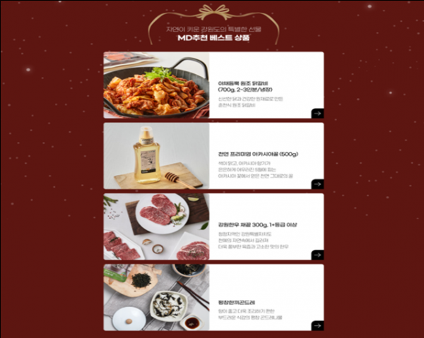 기획전 기간 중 강원한우, 쌀그래놀라·콩콩쉐이크프로틴, 한끼곤드레·곤드레국수, 두부티라미수·비건두부마요, 닭갈비·인삼한돈갈비, 천연 꿀 등이 판매된다.