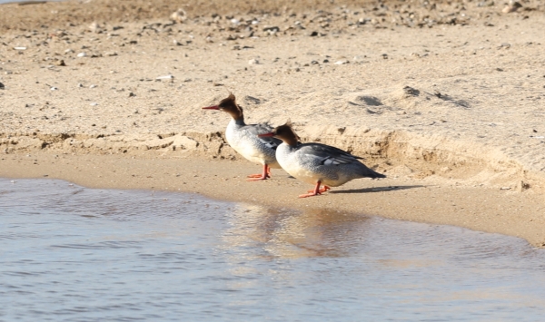 [충청뉴스큐] 충남 서산시 천수만 모래톱에서 22일 오후 3시경 호사비오리 암컷 2개체가 휴식을 취하고 있다.