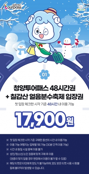 이번 패키지 상품은 ‘청양투어패스’ 48시간권과 ‘칠갑산 얼음분수축제 입장권’을 포함해 17,900원에 구매할 수 있다.