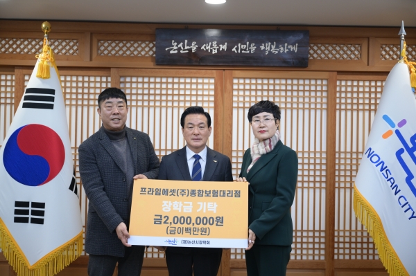 프라임에셋종합보험 대리점 정선필 지사장과 김서진 본부장이 지난 30일 논산시청을 방문해 논산지역 인재육성 및 어려운 학생들을 위해 사용해 달라며 장학금 2백만원을 기탁했다.