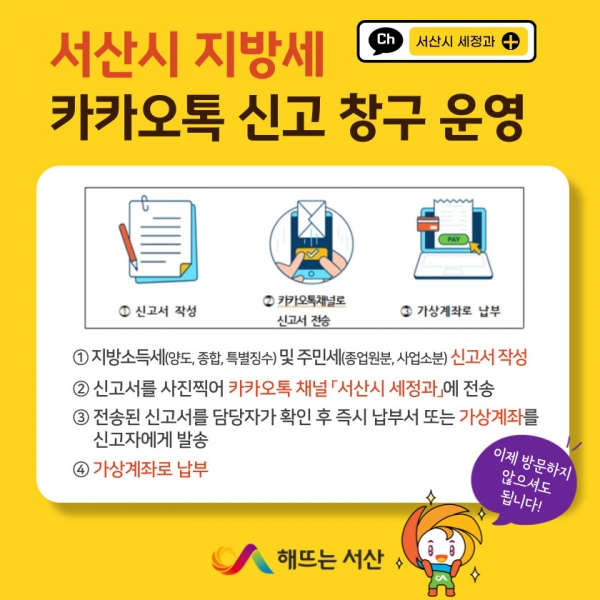 [충청뉴스큐] 충남 서산시가 비대면 세정 서비스를 확대하고 시민의 납세 편의를 향상하기 위해 올해부터 세정과 카카오톡 채널을 통해 ‘지방세 카카오톡 신고 창구’를 운영한다고 7일 밝혔다.