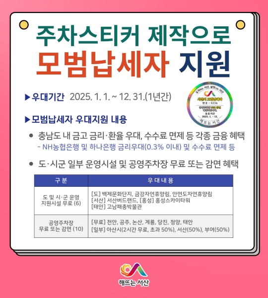 서산시 관내 모범납세자는 554명이며 시는 모범납세자증과 함께 주차스티커를 등기우편으로 발송할 계획이다.