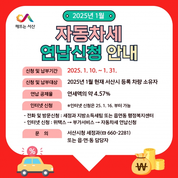 [충청뉴스큐] 충남 서산시는 2025년 자동차세 연납 신청을 31일까지 받는다고 밝혔다.