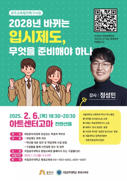 입시설명회 사전 접수는 국립공주대학교 평생학습원 누리집 또는 QR코드를 통한 구글폼 신청서를 제출하면 되고 선착순 300명을 모집한다.