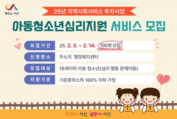 [충청뉴스큐] 충남 서산시가 2월 3일부터 14일까지 올해 상반기 아동·청소년 심리지원 서비스의 이용자 100명을 모집한다고 밝혔다.