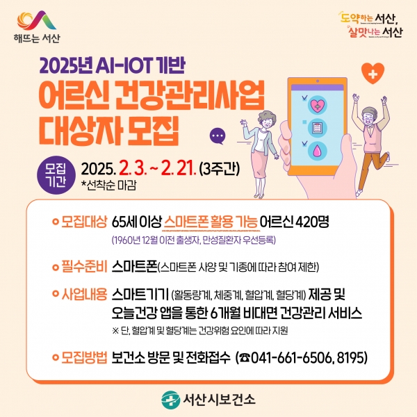 [충청뉴스큐] 충남 서산시가 인공지능·사물인터넷 기반 어르신 건강관리사업 대상자를 모집한다고 밝혔다.
