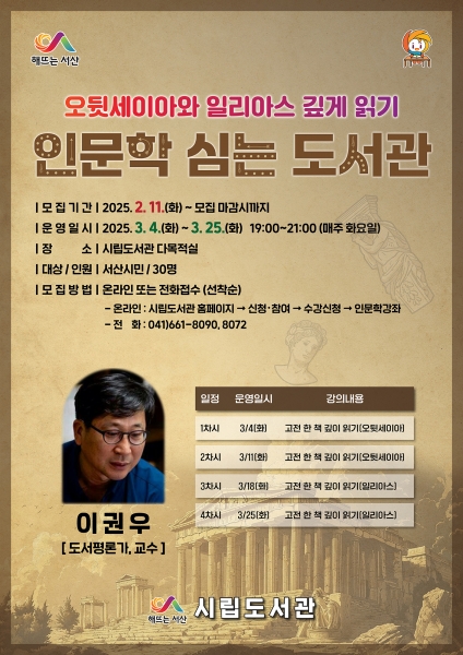 인문학 심는 도서관 강좌는 시민에게 인문학적 성찰 기회를 제공하기 위해 마련됐으며 3월부터 6월까지 4개 주제, 총 16회의 강좌를 진행할 예정이다.