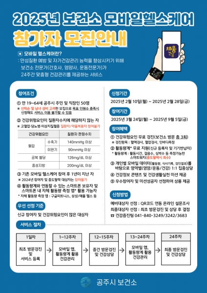 [충청뉴스큐] 공주시는 스마트폰과 앱을 활용해 간편하고 쉽게 개인이 맞춤형 건강관리 서비스를 받을 수 있는 모바일 헬스케어 사업 대상자 50명을 오는 28일까지 선착순 모집한다.