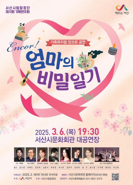 [충청뉴스큐] 충남 서산시는 시립합창단이 지난해 3월 큰 호응을 얻었던 ‘엄마의 비밀일기’를 제11회 기획 연주회로 다시 선보인다고 10일 밝혔다.