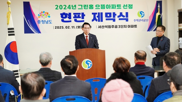 [충청뉴스큐] 충남 서산시는 지난해 ‘충청남도 그린홈 으뜸아파트’에 선정된 석림주공3단지아파트에서 11일 으뜸아파트 현판식이 개최됐다고 밝혔다.