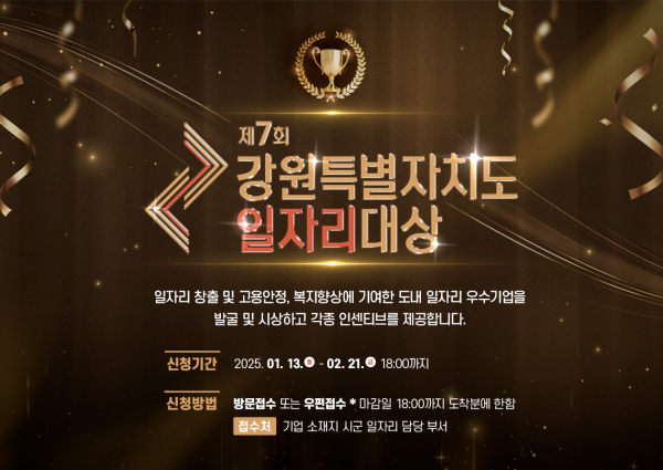 [충청뉴스큐] 강원특별자치도는 도내 우수 일자리 창출 기업을 발굴하고 시상하는 ‘제7회 강원특별자치도 일자리대상’ 공모를 실시한다고 밝혔다.