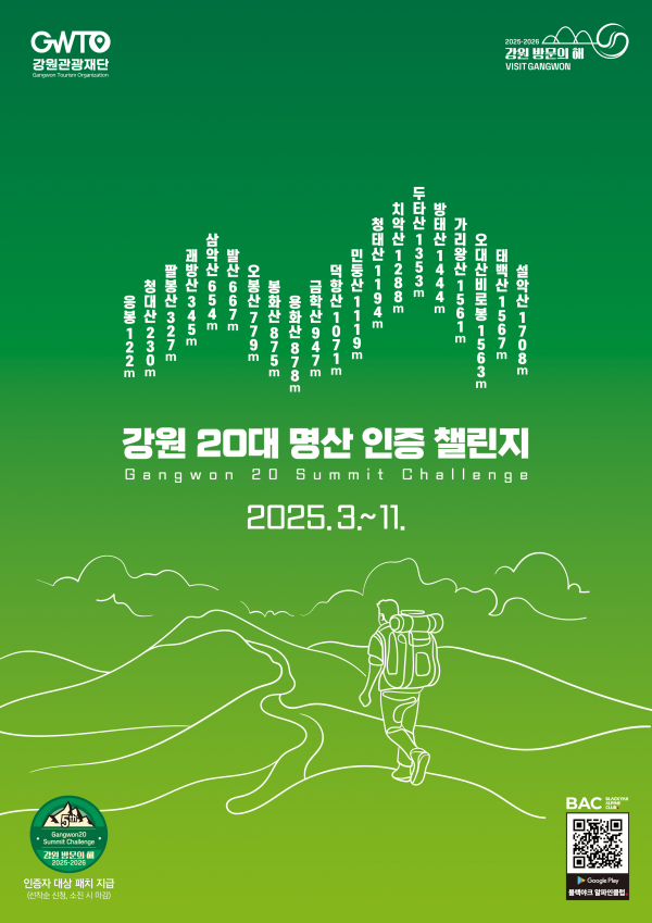 [충청뉴스큐] 강원특별자치도와 강원관광재단은 오는 3월부터 11월까지 ‘강원 20대 명산 인증 챌린지’를 운영한다.
