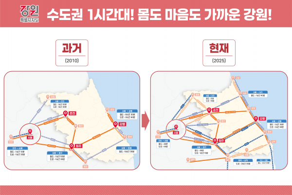 또한, 각종 도정 홍보 시 교통망 확충 정보를 강조하고 ‘가까운 강원’ 접근성 홍보 영상을 제작해 SNS·유튜브 등을 활용해 널리 전파한다.