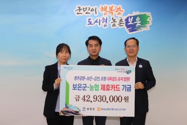 [충청뉴스큐] NH농협은행 보은군지부는 지난 27일 제휴카드 사용 적립기금 4,293만원을 보은군에 전달했다.