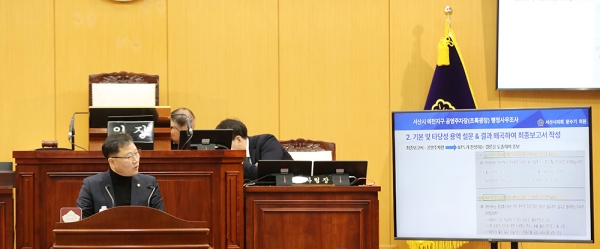 [충청뉴스큐] 서산시의회 문수기 의원은 지난 3월 5일 서산시의회 제303회 임시회 본회의에서 서산시 예천지구 공영주차장 조성 사업에 대한 행정사무조사 요구의 건을 대표발의 하며 제안설명을 통해 사업 추진 과정에서의 문제점을 PPT로 활용해 20여분 간 강력히 지적했다.