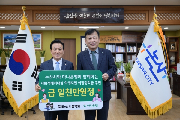 하나은행 김세용 대표는 “논산 지역의 희망이자 논산시 발전에 기여할 수 있는 자랑스러운 학생들의 인재육성에 보탬이 되길 바란다”며 “앞으로도 논산시에 꾸준한 관심을 갖고 지역사회와 함께 성장하는 은행으로서 다양한 사회 공헌 활동을 지속적으로 추진하겠다”고 말했다.