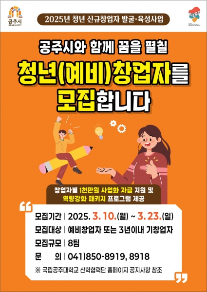 [충청뉴스큐] 공주시는 지역 청년들의 창업 활성화를 위해 ‘청년 신규 창업자 발굴·육성 사업’ 참여자를 오는 21일까지 모집한다고 밝혔다.