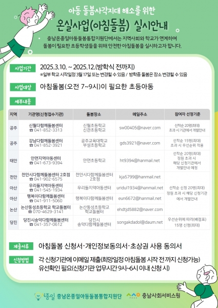 충남온종일아동돌봄통합지원단이 추진하는 아침 돌봄 ‘온실’ 사업은 공주시와 지역 내 돌봄 기관, 지역 초등학교가 협력해 돌봄이 필요한 초등학생들과 학부모를 위해 제공하는 맞춤형 돌봄 사업이다.