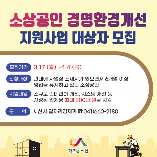 [충청뉴스큐] 충남 서산시가 소상공인의 경영 안정, 경쟁력 강화를 위해 ‘소상공인 경영환경개선 지원사업’ 진행한다고 17일 밝혔다.