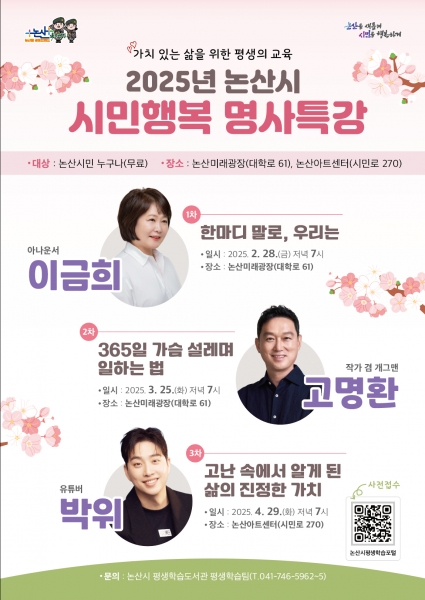 [충청뉴스큐] 논산시가 오는 3월 25일 저녁 7시 논산아트센터에서 두 번째 시민행복 명사특강을 개최한다.