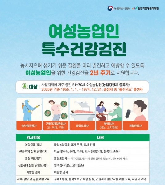 [충청뉴스큐] 충북 괴산군이 여성농업인의 의료복지 향상을 위해 ‘2025년 여성농업인 특수건강검진’ 대상자를 추가 모집한다고 18일 밝혔다.