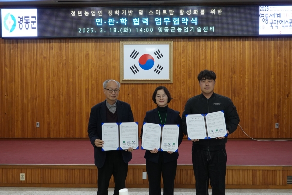 [충청뉴스큐] 충북 영동군은 청년농업인의 안정적인 정착과 스마트팜 교육·연구 인프라 구축을 위해 유원대학교 스마트팜학과, 영동군4-H연합회와 업무협약을 체결했다고 밝혔다.
