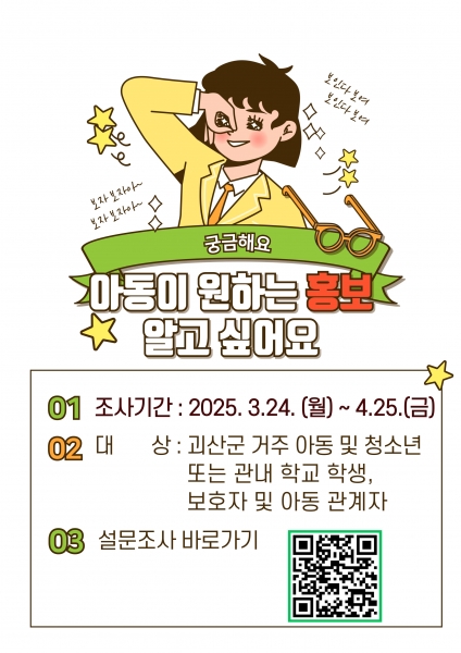 [충청뉴스큐] 충북 괴산군은 오는 4월 25일까지 아동 정책 사업 홍보에 대한 만족도 설문조사를 실시한다고 밝혔다.