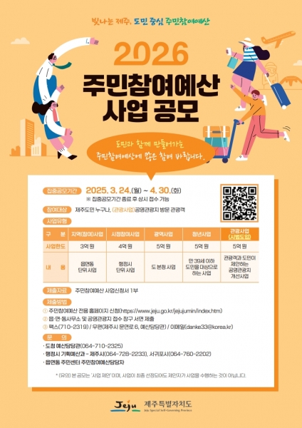[충청뉴스큐] 제주특별자치도가 주민참여예산 공모규모를 일반회계 예산의 1% 수준으로 확대하고 2026년도 예산편성에 반영할 주민참여예산 사업을 4월 30일까지 집중 공모한다.