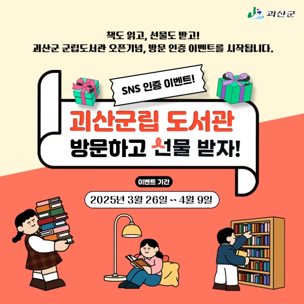 참여 방법은 괴산군 공식 SNS를 팔로우한 뒤, 괴산군립도서관을 방문해 인증샷을 찍고 이벤트 게시글에 해당 사진과 해시태그, 응원 댓글을 남기면 된다.