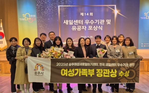 [충청뉴스큐] 공주시는 지난 28일 여성가족부 주관으로 열린 ‘제14회 새일센터 우수기관 및 유공자 포상식’에서 공주여성새로일하기센터가 우수기관으로 선정되어 여성가족부 장관상을 수상했다고 밝혔다.
