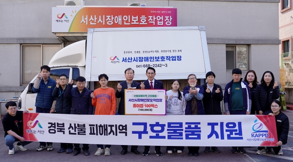시는 1일 서산시장애인보호작업장에서 산불 피해 이재민을 위해 150만원 상당의 종이컵 10만 개를 기탁했다고 밝혔다.