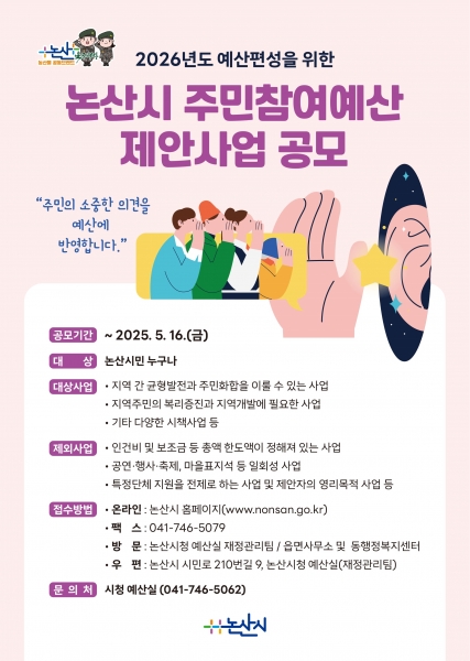 [충청뉴스큐] 논산시는 오는 5월 16일까지 ‘2026년도 예산편성을 위한 주민참여예산 제안사업 공모’를 진행한다.