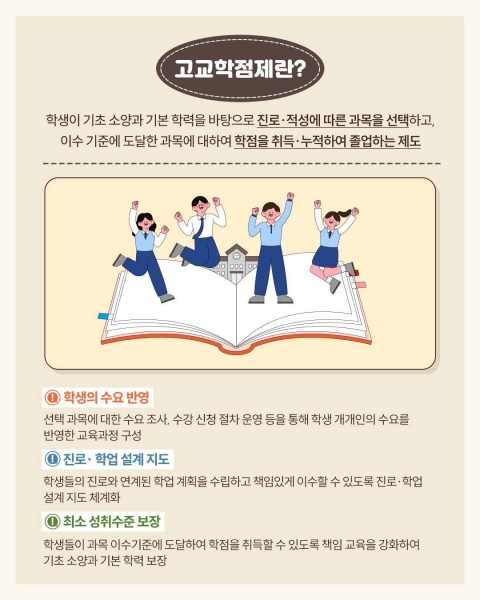 고교학점제는 학생이 기초 소양과 기본 학력을 바탕으로 진로와 적성에 따라 필요한 과목을 선택·이수하고 학점을 취득해 졸업하는 제도이다.