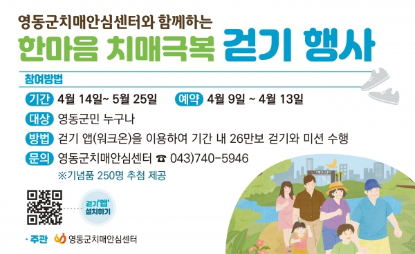 [충청뉴스큐] 충북 영동군 보건소 치매안심센터가 오는 14일부터 다음 달 25일까지 42일간 ‘2025년 한마음 치매극복 온라인 걷기 행사’를 개최한다.