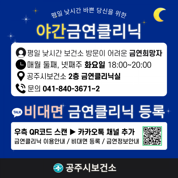 시는 ‘공주시보건소금연클리닉’ 카카오톡 채널을 개설해 △금연클리닉 및 찾아가는 금연클리닉 이용 안내 △비대면 금연클리닉 등록 △금연 관련 최신 정보 제공 등의 서비스를 제공할 예정이다.