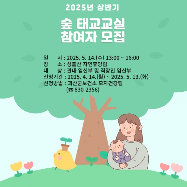 이번 프로그램은 오는 5월 14일 괴산군 대표 산림휴양시설인 성불산 자연휴양림에서 열리며 군내에 거주하거나 직장을 둔 임신부라면 누구나 참여할 수 있다.