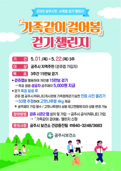 이번 사업은 2024년 질병관리청 지역사회 건강조사 결과 공주시의 걷기 실천율이 44.5%로 전국 중앙값인 50.3%, 충청남도 평균인 54.7%보다 낮게 나타남에 따라 시민들의 걷기 실천을 높이기 위해 마련됐다.