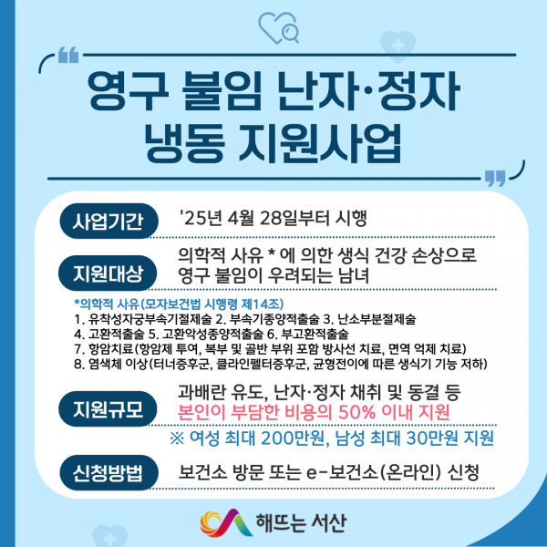 [충청뉴스큐] 충남 서산시가 28일부터 의료행위로 인한 생식기능 손상으로 영구 불임이 예상되는 시민에게 난자·정자 냉동 지원사업을 시행한다고 밝혔다.