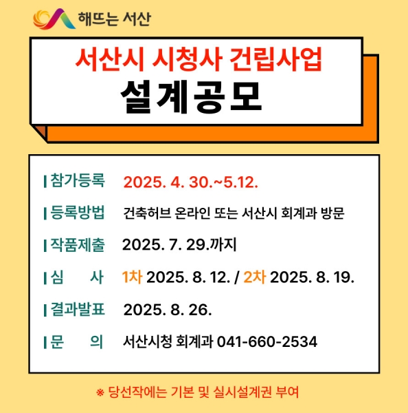 이완섭 서산시장은 “시청사는 시민 모두의 얼굴로 서산의 역사와 미래 비전을 담는 상징적 건축물이 될 것”이라며 “참신하고 우수한 설계작품이 나올 수 있도록 많은 건축사의 적극적인 참여를 기대한다”고 말했다.