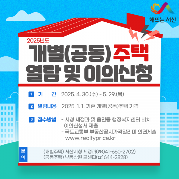 개별주택 공시가격에 대한 자세한 사항은 서산시 세정과에, 공동주택 공시가격은 공동주택 콜센터에 문의하면 된다.