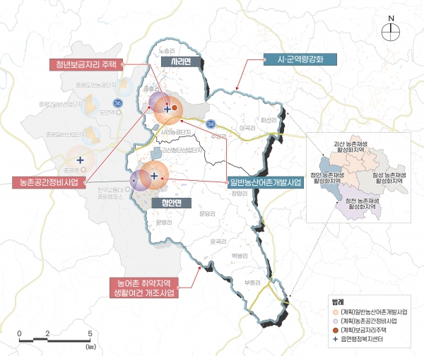 이번 공모사업은 청안·사리면 일원에 총 411억원 규모로 △일반농산어촌개발사업 2개소, △농촌공간정비사업 2개소, △청년보금자리주택조성사업 1개소 등을 계획 중이며 세부 사업계획은 농식품부와 협의를 거쳐 확정될 예정이다.